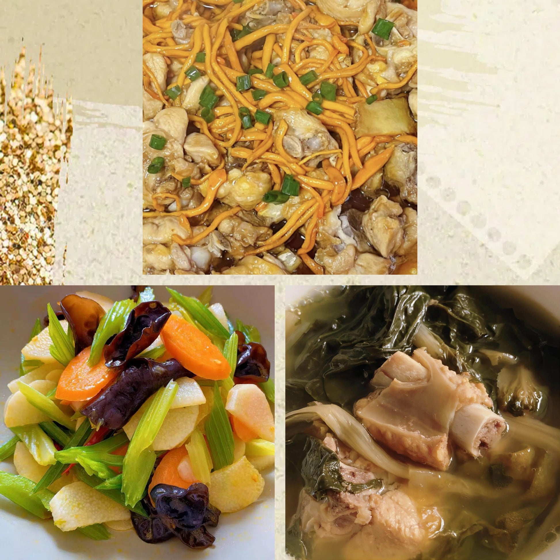 2月20日周五(D餐)精致小餐:虫草花茶树菇蒸土鸡 西芹炒山药 白菜干煲猪骨汤