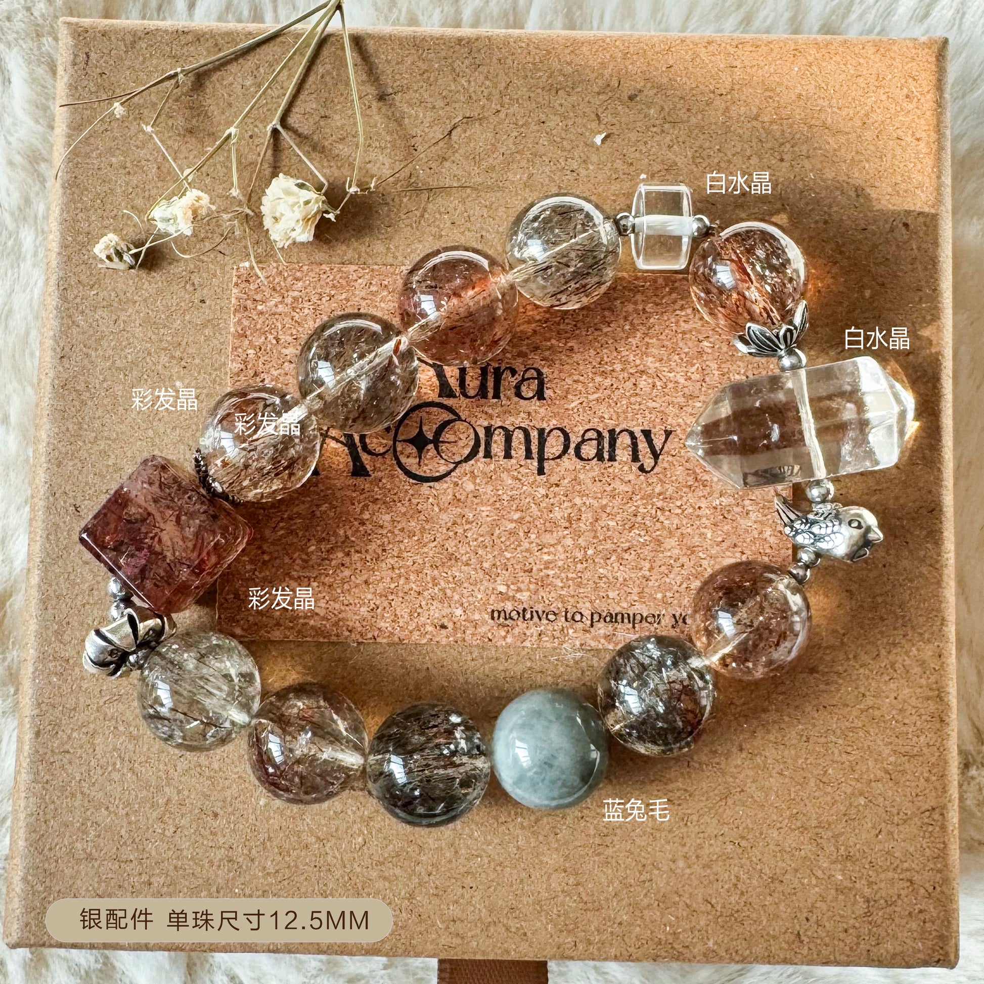 彩发晶招引财富流转,幽灵方糖护佑诸事安宁。白水晶双肩如枝,栖落一缕雀灵;蓝兔毛是点睛之蓝,点亮腕间方寸天地。藏纳万象,相生于腕。